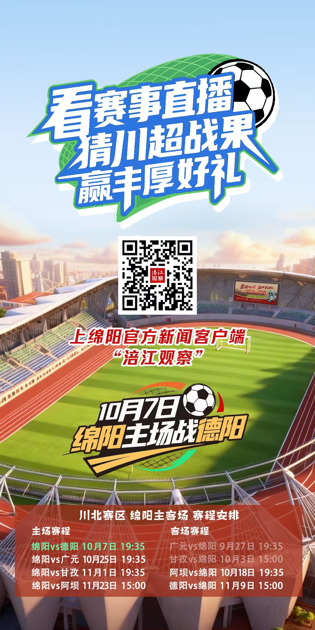 (点击上方图片直达竞猜页面↑↑) 绵阳队VS德阳队 “大战”一触即发! ✊✊✊ 10月7日19:35 绵阳三台县体育场 绵阳 九洲长虹队 主场 迎战 德阳 重装队 这不仅是一场积分争夺赛 更是一场足球狂欢 👊👊👊 门票秒空?别慌! 绵阳官方新闻客户端涪江观察 将进行全程直播 直播平台还有: 四川卫视文旅频道 四川观察新闻客户端 直播绵阳抖音号 涪江观察微信视频号等 让你不错过每一个精彩瞬间 光看球不过瘾? 那就来当预言家 还有丰谷酒王 华为Pura 80 Pro手机 等你来拿! 活动详情请戳👇 《绵阳VS德阳!价值6万元丰谷酒、华为手机等你来!|川超有奖竞猜》 (点击上方图片直达竞猜页面↑↑) 想找地方跟大家一起嗨? 我们也为你安排好了! 全市19处指定第二观赛点 +200余个热门观赛点已全面就绪 还有18家影院将进行公益免费观赛 进球还能赢500张电影票 氛围绝对比家里好! 快点加入👇 《绵阳VS德阳,门票售罄!“涪江观察”和全市200多个“第二观赛点”免费观赛》 立即下载登录涪江观察 看直播、猜胜负、赢大奖 10月7日19:35 我们一起为绵阳加油! 扫描二维码 安装绵阳官方新闻客户端 涪江观察 赢更多好礼 或在各大手机应用市场 搜索“涪江观察”下载安装 商务合作热线: 18780409991 (涪江观察编辑部 文婷/文案)