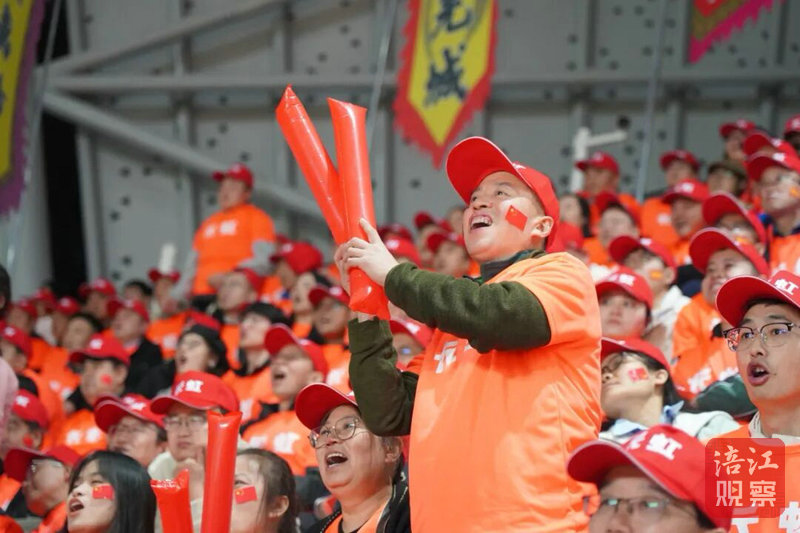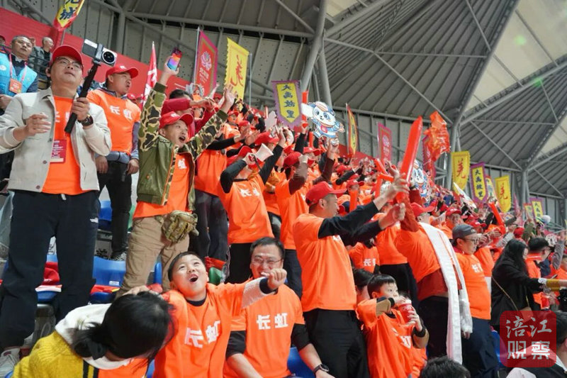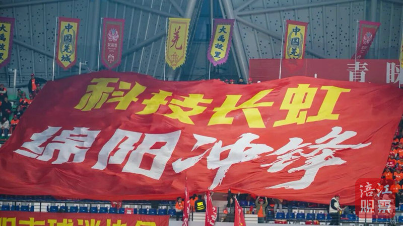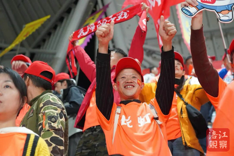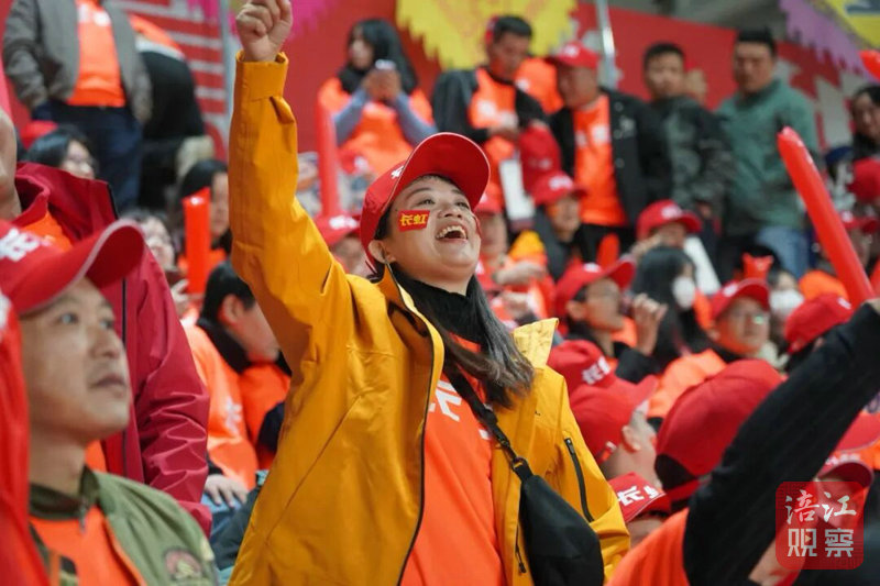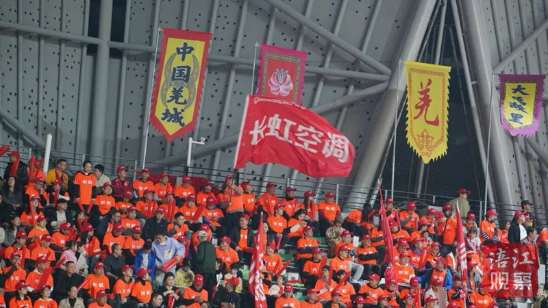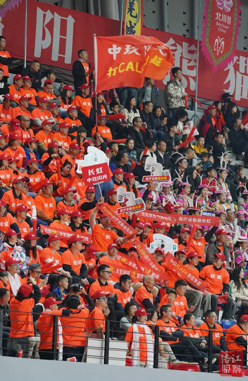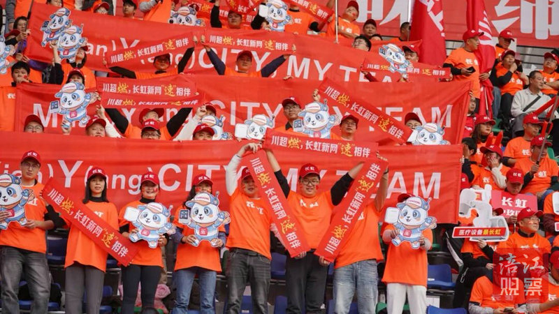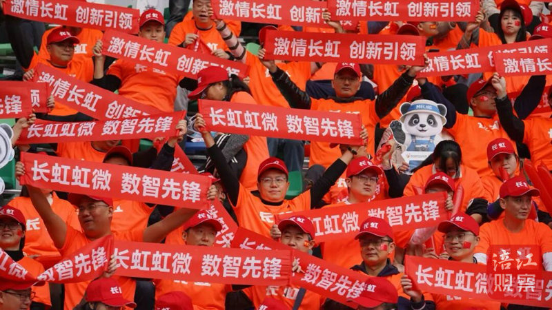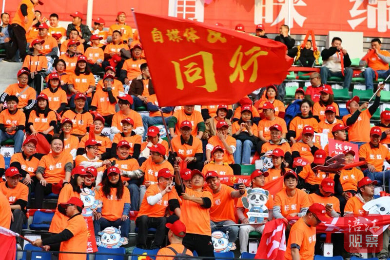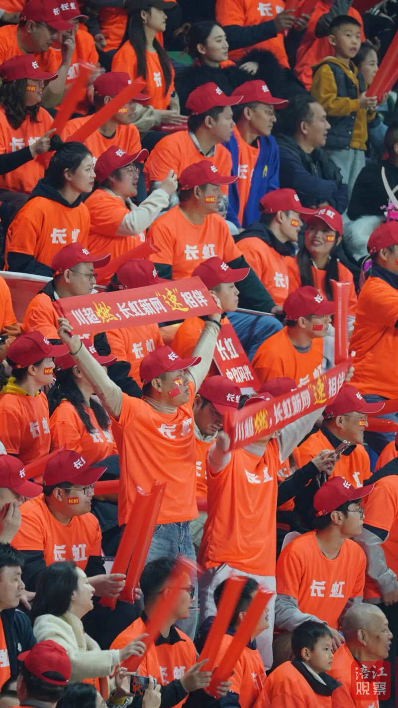 看台上,身着统一橙色员工服红色长虹帽的长虹球迷方阵时而屏息凝神关注攻防,时而起身欢呼进球。