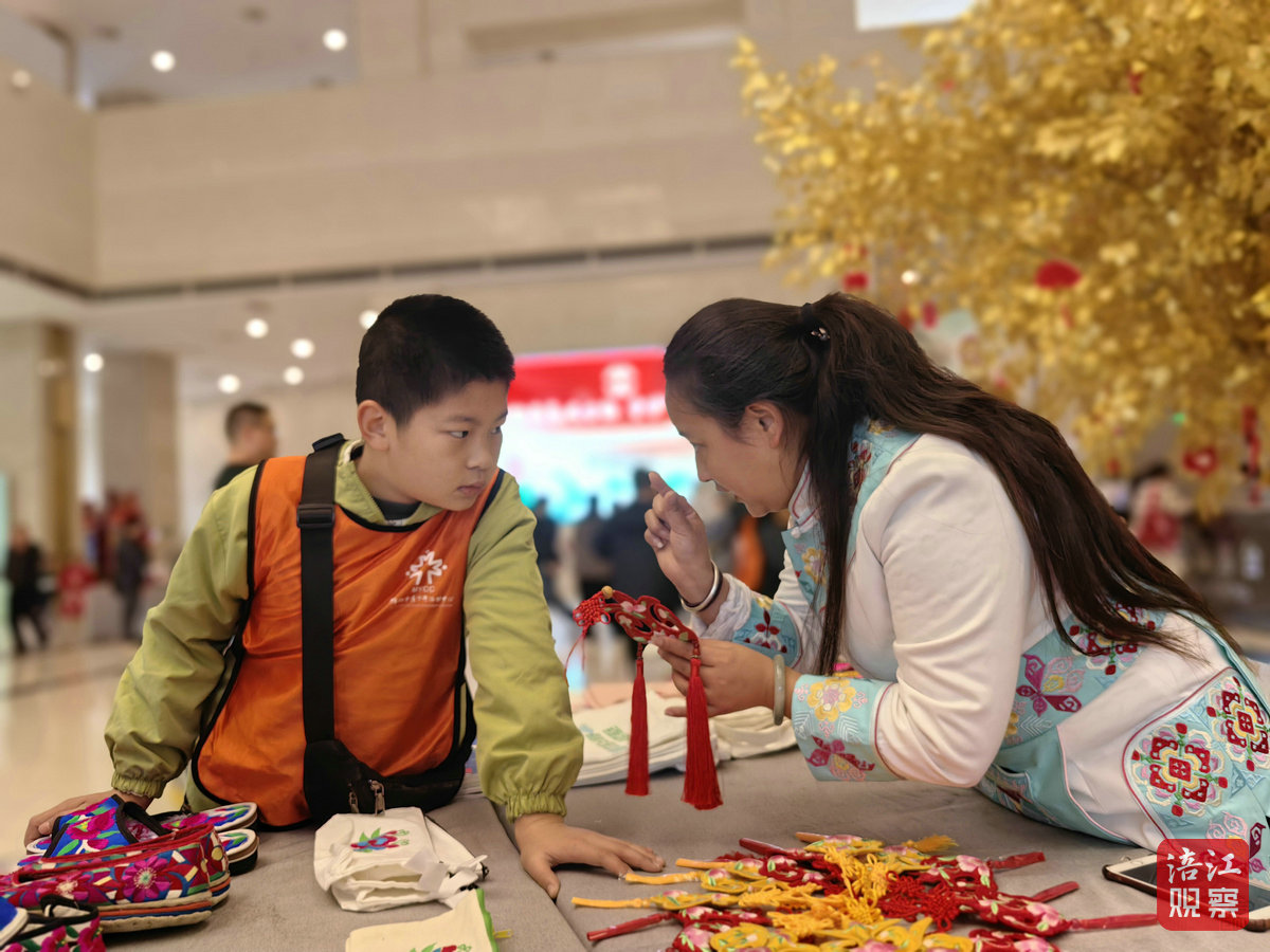 在羌族服饰体验点,游客和市民穿上羌族服饰,拍照留影。三台泥塑体验点也围满了人,小朋友们在传承人周勇的辅导下,用一坨黏土捏制出一个个可爱的小狗、兔子。在北川羌绣体验点,几位小朋友在传承人杨红莉的示范下体验穿针引线。在北川竹编、三台木刻等点位,也吸引了很多家长和小朋友现场体验。