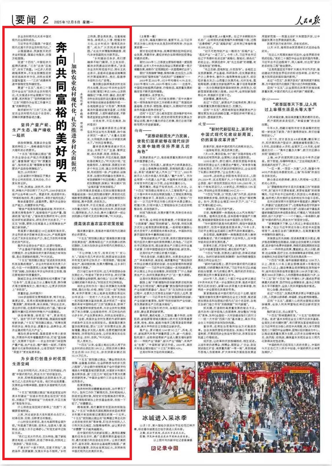 12月8日,《人民日报》刊发文章《奔向共同富裕的美好明天——加快农业农村现代化,扎实推进乡村全面振兴》,聚焦农业农村现代化建设,回望“十四五”,展望“十五五”。其中,关注了绵阳江油市双石村落实强农惠农富农政策,通过数字乡村平台建设,让乡村产业发展有奔头,村民生活有甜头。全文如下: 奔向共同富裕的美好明天