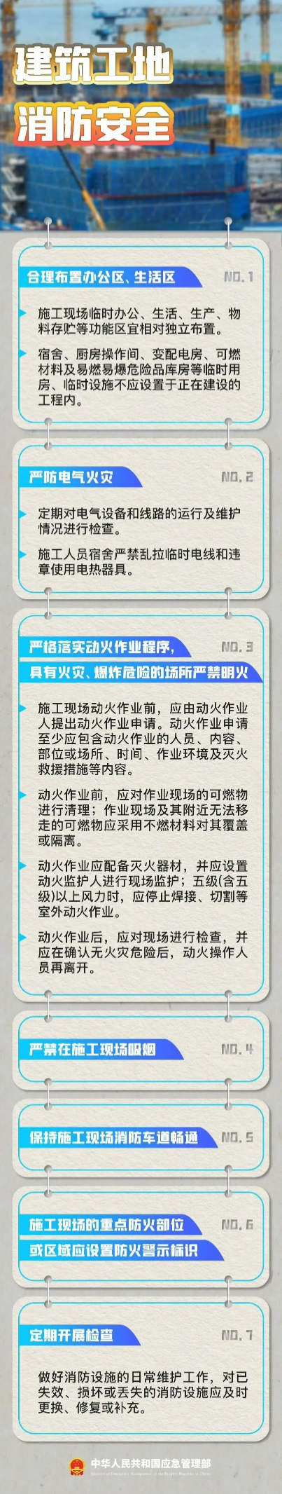 临近年末岁尾,建筑施工项目普遍抢工期、赶进度,施工过程中的用电、动火作业增多,叠加冬季气候寒冷,建筑工地用火用气用电量大,容易引发火灾事故。 近日,市安办工作组对部分在建项目工地进行走访,现将发现的典型火灾隐患集中曝光,警示各项目业主、施工及监理单位提高警惕,起底式排查各类消防隐患,严格规范特殊作业和用火用气用电行为,切实筑牢冬季施工“防火墙”。 可燃材料与办公用房防火间距不足。 法规解读:《建设工程施工现场安全技术标准》第三条3.2.2规定,施工现场主要临时用房、临时设施的防火间距要求变配电房与可燃材料堆场及加工场防火间距不小于7m。 施工现场消防水泵电线线路接在三级配电箱上。 法规解读:《建设工程施工现场安全技术标准》第五条5.1.4A规定,施工现场的消防水泵应采用专用消防配电线路,专用消防配电线路应自施工现场总配电箱保护装置的上端接入,且应在火灾发生时保持不断电。 油漆稀料(易燃液体)未存放专用场所,存在消防风险。 法规解读:《建筑施工安全检查标准》3.2.3第4条规定,材料保管(5)易燃易爆物品应分类储藏在专用库房内,并应制定防火措施。 工棚区设置的消火栓无水。 法规解读:《中华人民共和国消防法》第十六条规定,机关、团体、企业、事业等单位应当履行下列消防安全职责:(二)按照国家标准、行业标准配置消防设施、器材,设置消防安全标志,并定期组织检验、维修,确保完好有效。 可燃材料与变配电房防火间距不足。 法规解读:《建设工程施工现场安全技术标准》第三条3.2.2规定,施工现场主要临时用房、临时设施的防火间距要求变配电房与可燃材料堆场及加工场防火间距不小于7m。 灭火器设置不规范。 法规解读:《建筑灭火器配置设计规范》第五条5.1.4规定,灭火器不宜设置在潮湿、强腐蚀性地点。当必须设置时,应有相应的保护措施。灭火器设置在室外时,应有相应的保护措施。 办公区配备的一组灭火器其中一具失效。 法规解读:《中华人民共和国消防法》第十六条规定,机关、团体、企业、事业等单位应当履行下列消防安全职责:(二)按照国家标准、行业标准配置消防设施、器材,设置消防安全标志,并定期组织检验、维修,确保完好有效。 电瓶车充电区未配备灭火器,电源插座防水盖缺失。 法规解读:《电动自行车充电及停放场所消防安全管理》第六条第1款规定,电动自行车充电及停放场所应按中危险Ⅱ级场所配置灭火器,每50㎡应配置不少于1具5kg的ABC类干粉灭火器,且每个场所不应少于2具。 如何防范建筑施工火灾事故? 一起学习