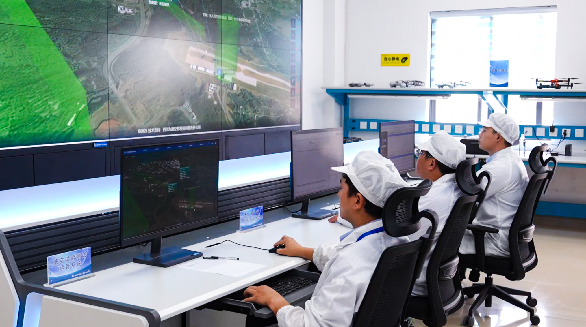 中国(绵阳)科技城低空装备检验检测认证中心的测试人员,正在通过低空测试运管管理系统进行飞行测试运行管理和测试过程数据监视管控。九洲集团供图